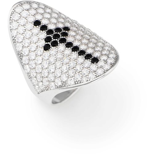 Anello Da Donna Di Amen Della Collezione Croci. Anello In Argento 925 Di Colore Rodio Con Zirconi Bianchi E Neri. Anello Di Misura 14.