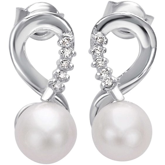 ORECCHINI IN ORO BIANCO 18 KT CON PERLA FRESHWATER QUALITA' AAA DIAMETRO 6/6,5. MONTATURA CON PERNO E FARFALLINA E DIAMANTI TAGLIO BRILLANTE CT 0.05 G/H VS