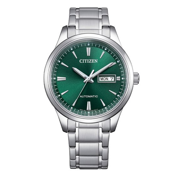 Orologio Meccanico Automatico solo tempo Uomo. Cassa acciaio lucido fondo a vite con vista movimento. Movimento Meccanico Automatico Citizen 21 rubini , 21.600 oscillazioni all'ora , riserva di carica 40 ore, stop secondi. Vetro minerale bisellato. Quadrante verde indici e lancette lucide e luminescenti, day date. Bracciale regolabile in acciaio satinato e lucido chiusura deployante con pulsanti. Impermeabile 5 atm. Scatola e Garanzia 5 anni originale