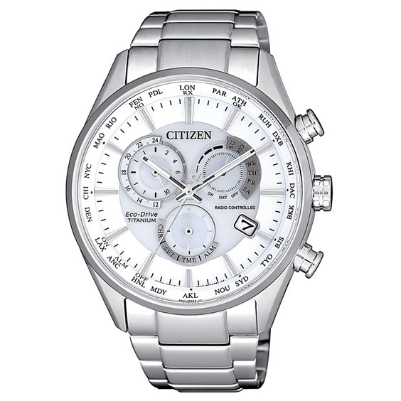 Orologio da uomo Cronografo Multifunzioni Eco-Drive a carica luce con riserva di carica di 10 mesi(fino a 3 anni in modalità risparmio energetico). Funzioni: radiocontrollato multibanda a 5 canali con ricezione dei segnale orario Europa, USA, Giappone (est e ovest) e Cina. Dotato di molteplici funzioni: - orario: ore, minuti e secondi; - giorno e data; - 24 H; - ora locale per 24 città; - allarme (sveglia); - calendario perpetuo; - cronometro per un massimo di 60 minuti con tempi di 1/20 di secondo - - avviso di carica insufficiente. Cassa in SuperTitanio spazzolato e lucido. Vetro zaffiro antigraffio. Quadrante bianco- lancette ore e minuti luminor. Bracciale in SuperTitanio regolabile con chiusura a pulsanti.Impermeabile 10 bar.(atm.) Scatola Originale. Garanzia 2 anni.