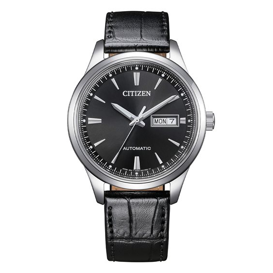 Orologio Meccanico Automatico solo tempo Uomo. Cassa acciaio lucido, fondo a vite con vista movimento. Movimento Meccanico Automatico Citizen 21 rubini , 21.600 oscillazioni all'ora , riserva di carica 40 ore, stop secondi. Vetro minerale bisellato. Quadrante nero indici e lancette lucide e luminescenti , day date. Cinturino in pelle nera opaca stampa alligatore fibbia con ardiglione e logo. Impermeabile 5 atm. Scatola e Garanzia 5 anni originali.