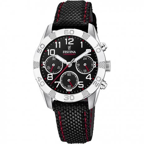 Orologio Festina bimbo. Cassa mm 36 in acciaio 316L, cinturino in pelle e tessuto tecnico nero con cuciture rosse. Quadrante nero con numeri arabi argento. Movimento multifunzione al quarzo, vetro minerale. Impermeabilità 5 atmosfere.