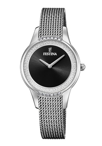 Orologio Festina da donna con movimento al quarzo e funzioni di solo tempo. Cassa in acciaio inox dal diametro di 30,2 mm impreziosita da cristalli bianchi. ... Cinturino in maglia milano d'acciaio anallergico; chiusura deployante con pulsanti. Resistente all'acqua fino a 50 metri di profondità.