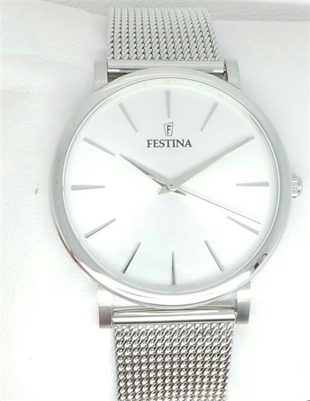 Orologio solo tempo unisex 38mm diametro cassa di festina con cassa in acciaio di forma rotonda quadrante argentato , indici e lancette argento. Orologio Con bracciale in acciaio maglia Milano, chiusura con slitta regolabile.Elegante uso quotidiano.