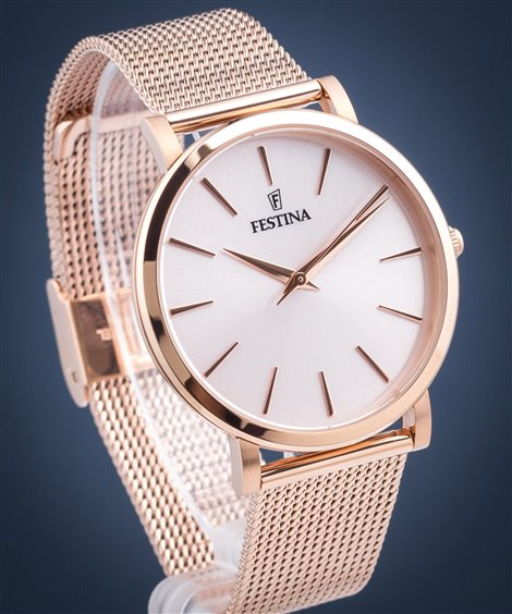 Orologio Festina da donna con movimento al quarzo e funzioni di solo tempo. Cassa in acciaio placcato oro rosa e dal diametro di 38 mm. Quadrante rose' con indici a bastoni. Cinturino in maglia milano d'acciaio rose gold largo 18,95 mm; chiusura a scatto. Resistente all'acqua fino a 30 metri di profondità. Appartiene alla collezione Boyfriend.