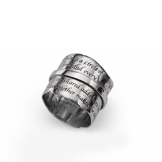 Anello in argento dall'effetto quasi 'grezzo' decorato con la scritta 'Our Family is a circle of strength and love every joy shared and crisis faced together make the circle stronger'. Un regalo perfetto per celebrare la famiglia.