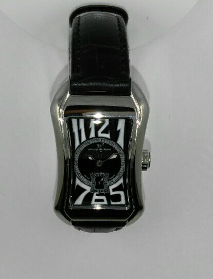 Cassa di forma allargata alle anse e ridotta al centro con profilo curvo realizzata in acciaio 316L, corona personalizzata, fondello curvo in acciaio solido con chiusura a 4 viti. Vetro minerale curvo ad alta trasparenza. Quadrante con lavorazione centrale guillochè, ring centrale rotondo e grandi cifre poste alle due estremità in senso verticale con bordi a contrasto, contasecondi alle 6. Lancette a freccia con luminescente al centro. Cinturino da 1816 in vera pelle di concia italiana a stampa alligatore con fondo in morbidissima pelle e fibbia ad ardiglione. Movimento al quarzo calibro 1L45. Water resistent a 100 mt. L'orologio è corredato di un elegante confezione in legno.