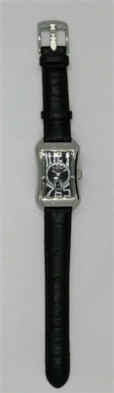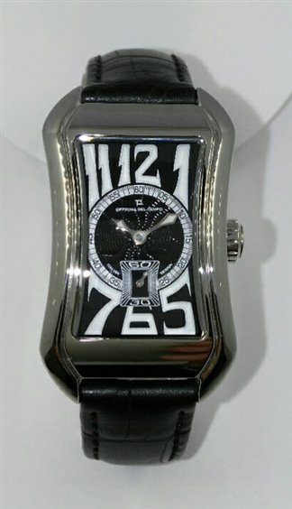 Cassa di forma allargata alle anse e ridotta al centro con profilo curvo realizzata in acciaio 316L, corona personalizzata, fondello curvo in acciaio solido con chiusura a 4 viti. Vetro minerale curvo ad alta trasparenza. Quadrante con lavorazione centrale guillochè, ring centrale rotondo e grandi cifre poste alle due estremità in senso verticale con bordi a contrasto, contasecondi alle 6. Lancette a freccia con luminescente al centro. Cinturino da 1816 in vera pelle di concia italiana a stampa alligatore con fondo in morbidissima pelle e fibbia ad ardiglione. Movimento al quarzo calibro 1L45. Water resistent a 100 mt. L'orologio è corredato di un elegante confezione in legno.
