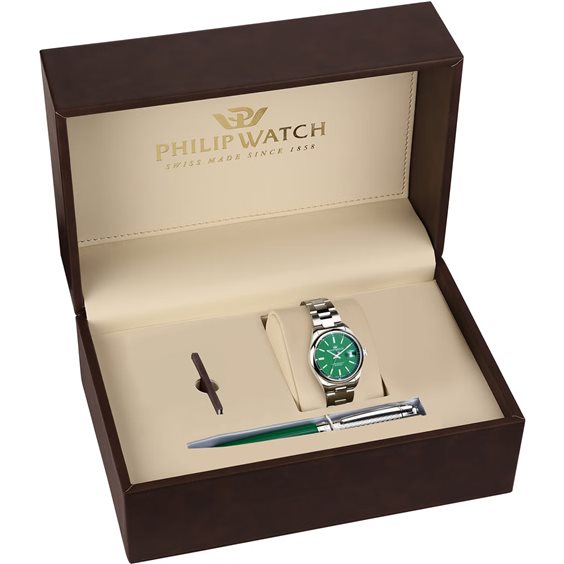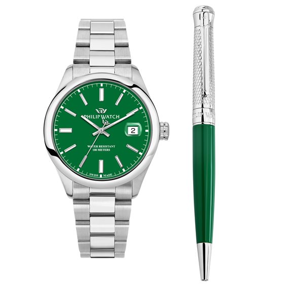 Special Pack Philip Watch Caribe Urban. Orologio: Cassa (mm 39) e cinturino in acciaio 316L. Quadrante verde con datario al 3. Corona e fondello a vite. Movimento svizzero al quarzo, vetro zaffiro. Impermeabilità 10 atmosfere. Penna: A sfera, in acciaio 316L. Colore verde e acciaio.