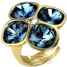 Anello in bronzo placcato oro giallo con cristalli swarovski color azzurro e bianco. Il gambo è aperto quindi la misura può essere adattata di circa 2 numeri in meno e fino a circa 7/8 numeri in più.