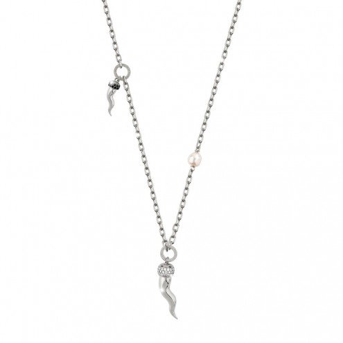 COLLANA REBECCA DELLA COLLEZIONE LUCKY IN BRONZO CON PVD ORO BIANCO LUNGA 86CM CON PERLA E 2 CORNETTI CON INCASSATI ZIRCONI BIANCHI E NERI