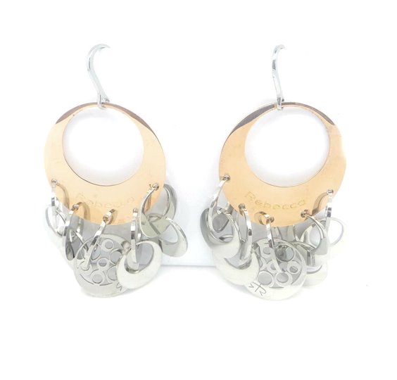Orecchini a cerchi in bronzo e acciaio lunghi 6.8 cm, il cerchio più grande diametro cm 3, con 5 cerchietti per orecchino, l'orecchino ha l'amo. Made in Italy. 2 anni di garanzia.