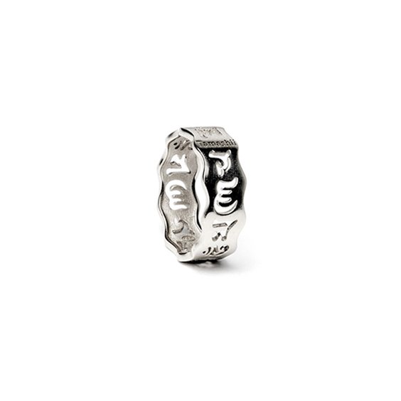 Anello originale Tamashii con inciso il mantra “Om Mani Padme Hūm” del Buddha della compassione Cenresig, tra i più noti e diffusi mantra del Buddhismo. Realizzato in Argento 925‰.