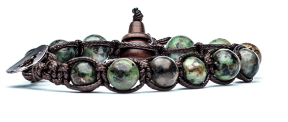 Bracciale Tamashii Turchese Africano. Cordoncino marrone in cotone cerato. Taglia unica ma predisposto per adattarsi ad ogni polso. Le pietre sono naturali perciò la foto è indicativa come tonalità, ma ogni bracciale è diverso. Il Turchese africano è una delle pietre più antiche, belle e ricche di mistero. Nell'Antico Egitto a questa pietra veniva riconosciuto il potere di depurare e proteggere, per cui veniva usata per i contenitori di cibi e bevande. Le coppe dei faraoni erano in turchese africano proprio per la credenza che questa preservasse la salute del sovrano da infezioni, malattie ma anche da energie negative. MADE IN TIBET