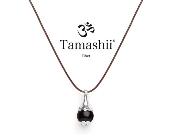 Girocollo in cordoncino con pendente in argento 925 rodiato e onice. Asole finali con bottone che permettono di regolare la misura.
