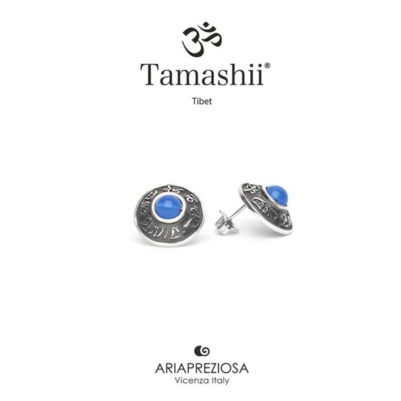 Il blu è il colore più importante nel buddhismo anche più dell'oro, identifica l’ascensione e la saggezza, la verità, la devozione, la fede, la purezza, la castità, la pace, la vita spirituale e intellettuale. Gli orecchini Tamashii® in Agata blu, tradizionalmente sono usati per identificare ciò che è puro o raro, calmano l’ira trasformandola in saggezza. Il design si ispira ai copricapi dei monaci per la precisione al copricapo RIG ZVA, indossato dagli allievi che hanno superato gli esami del corso del Sgrub Grva, cioè riservato agli Grub Bla Ma e agli abati (Gdan Sa). In Tibet il Lamaismo si divide in diverse scuole, tra le più caratteristiche e antiche c’è quella dei rNin ma pa, “gli antichi”, la seconda scuola. I loro monaci indossano diversi copricapi, ognuno dei quali identifica il ruolo gerarchico e spirituale all’interno della stessa scuola. Coppia di orecchini a lobo originali Tibetani Tamashii® in Argneto 925 anticato con pietre naturali di Agata blu. Tutti gli orecchini sono coordinati ai bracciali, da cui ereditano i principi fondamentali quali design tradizionale e pietre naturali. La loro forma richiama il copricapo RIG ZVA, nella circonferenza esterna a vista in rilievo troviamo il Mantra internamente invece il logo Tamashii®. Pietra della misura di 6 mm, chiusura in Argento 925 con farfallina. Diametro singolo orecchino: 1,7 cm